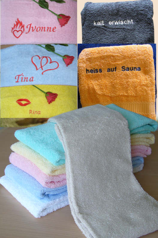 Individuell bestickte Saunahandtücher sind eine ganz besondere Aufmerksamkeit, ganz gleich, ob zum Geburtstag, zu Weihnachten, zu Ostern, zum Valtentinstag, zum Muttertag, zum Vatertag oder als spontanes Geschenk, um einfach nur mal zu sagen 'Ich denke an Dich'. Wer regelmäßig die Sauna besucht oder Freude an Wellness-Aktivitäten hat, freut sich über ein Saunatuch, das mit dem Namen bestickt ist und das so leicht wiedererkennbar ist.